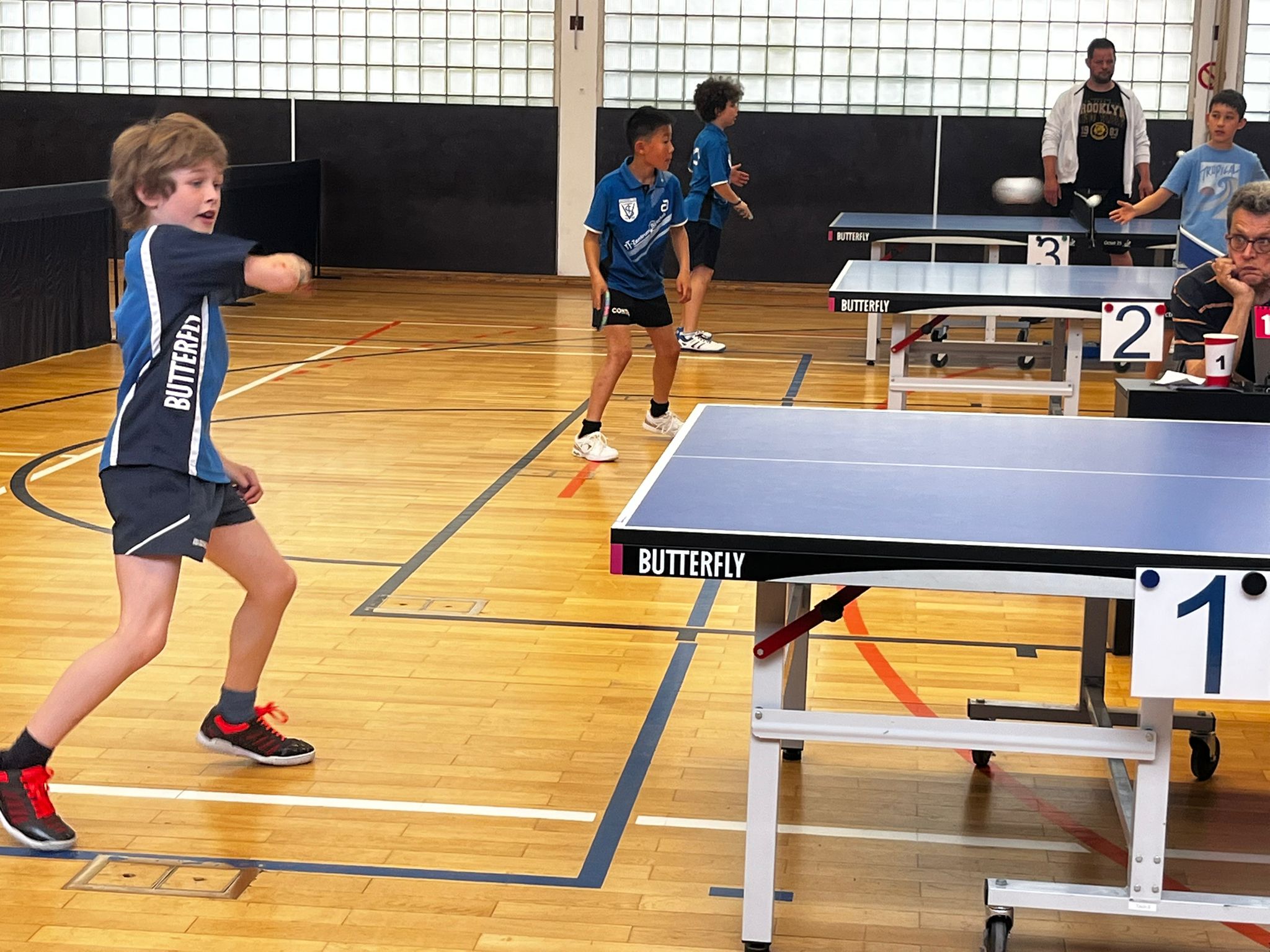 Damit müssen Leo und Alizée sich in der AK II für die Qualifikation zum Bundesfinale behaupten, denn nur die Sieger dieser Altersgruppe dürfen im Juni nach Baden-Württemberg fahren. Genug der Regeln, um 13.00 Uhr geht es weiter mit der AK II (2015/2014). Alizée und Leo bekommen Verstärkung von William, Vincent, Tim und Etienne. In dieser Altersklasse spielen die Kinder in 5 Gruppen – und was da gespielt wird! Keines der Kinder hat bisher in einer Mannschaft gespielt, die meisten haben nach dem Sommer angefangen und wir Zuschauer bekommen wirklich meisterhafte, lange Ballwechsel zu sehen. Da wird um jeden Ball gekämpft und wenn es 9:10 steht, gibt es kein einziges Spiel mit einem Verlegenheits-Schupf. Da wird geschossen und gespint! Grandios! Die Jungs haben ein wirklich leistungsstarkes Gegnerfeld und spielen alle gut – platziert, schnell, schlagkräftig und mutig! Die meisten schaffen es in die KO-Runde!