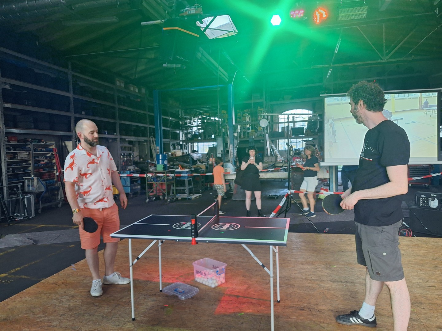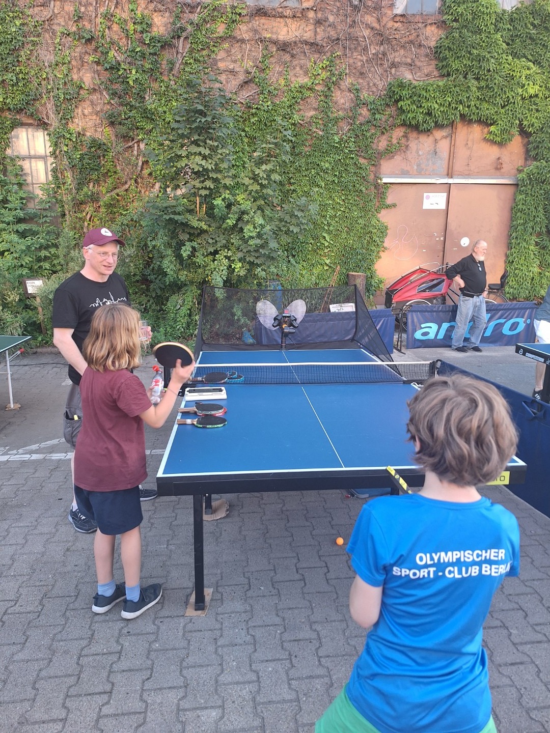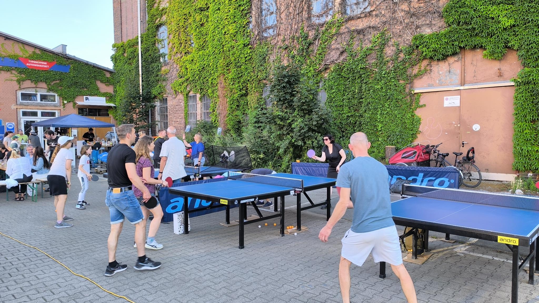 ewegung auf der Tanzfläche. Vor der Werkstatt standen drei Tischtennistische normaler Größe. Hier wurde fast wie im Training geschupft und geschmettert. Später bestand Daniel darauf, dass Robbi, der Tischtennisroboter, zum Einsatz kam. Robbi wurde so sehr beansprucht, dass später private Smartphones zum Steuergerät umfunktioniert wurden, denn der Akku des Tablets mit der Steuerungs-App war komplett entladen.
