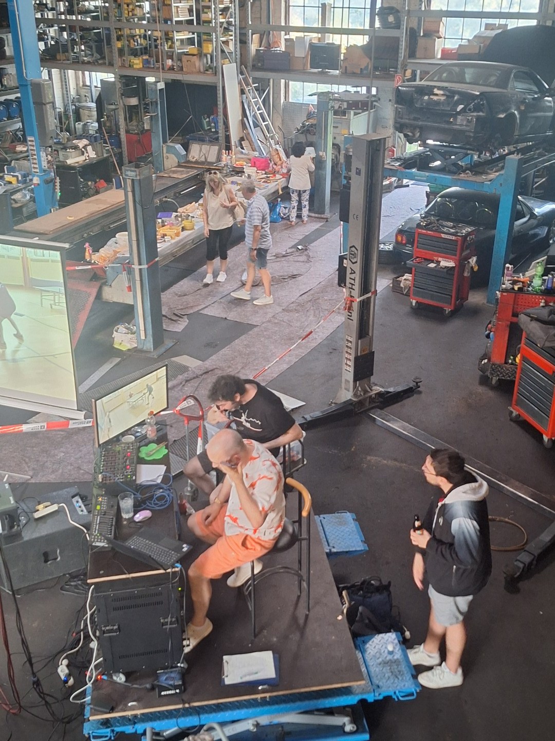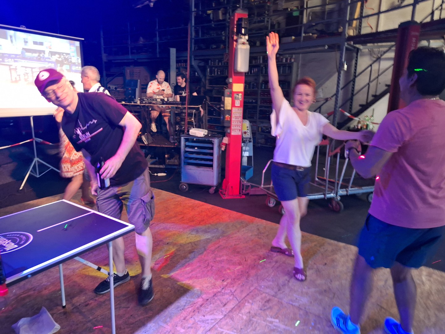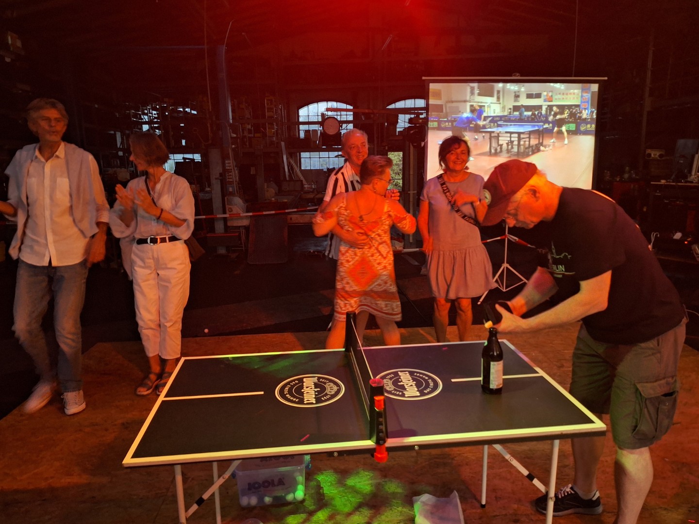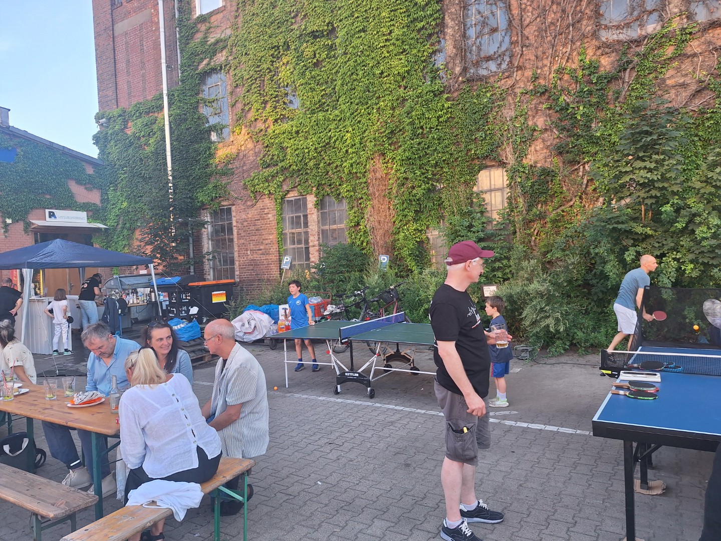 ewegung auf der Tanzfläche. Vor der Werkstatt standen drei Tischtennistische normaler Größe. Hier wurde fast wie im Training geschupft und geschmettert. Später bestand Daniel darauf, dass Robbi, der Tischtennisroboter, zum Einsatz kam. Robbi wurde so sehr beansprucht, dass später private Smartphones zum Steuergerät umfunktioniert wurden, denn der Akku des Tablets mit der Steuerungs-App war komplett entladen.